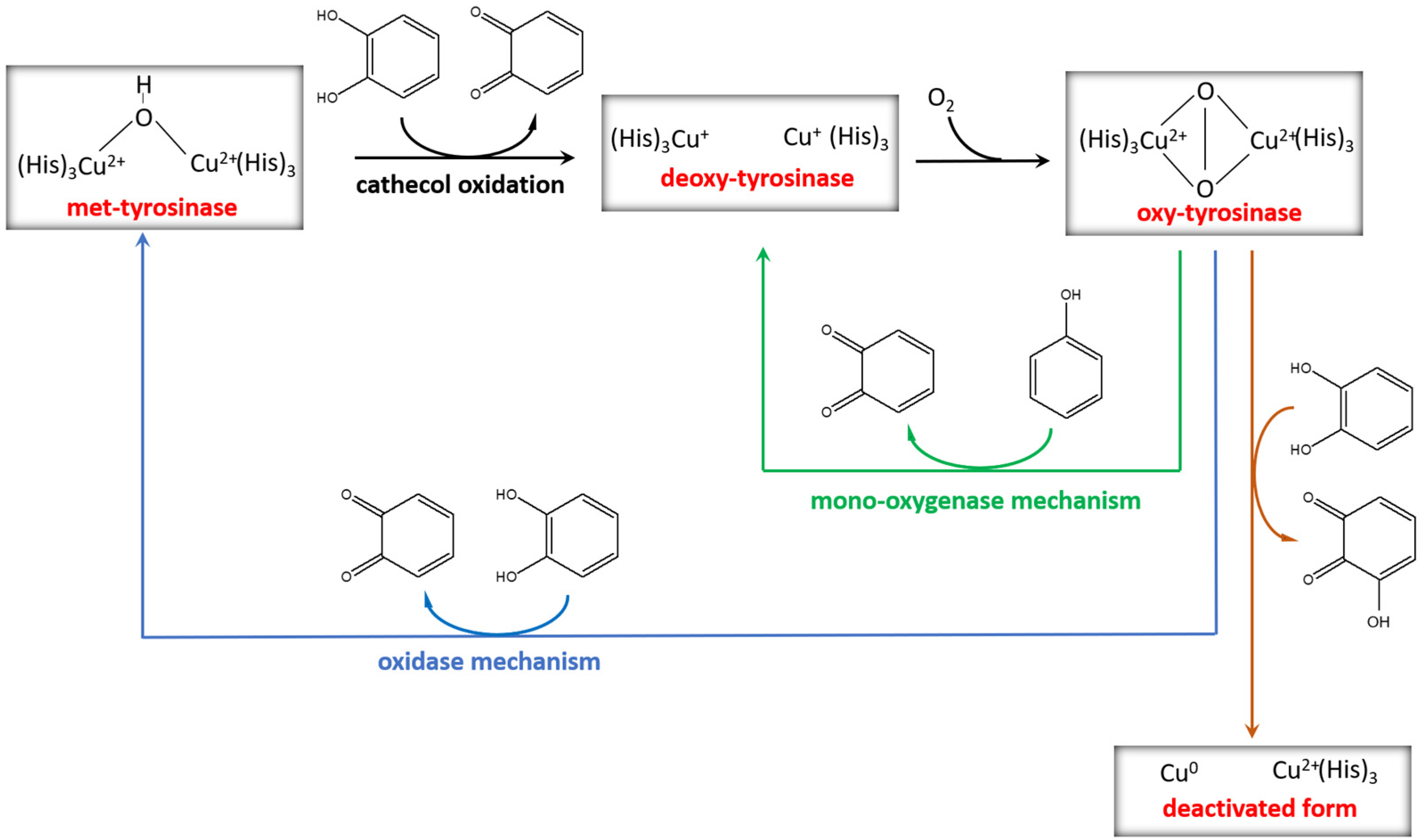 - Ramsden, C.A.; Riley, P.A. Tyrosinase: The four oxidation states of the active site and their relevance to enzymatic activation, oxidation and inactivation. Bioorg. Med. Chem. 2014, 22, 2388–2395. [Google Scholar] [CrossRef]