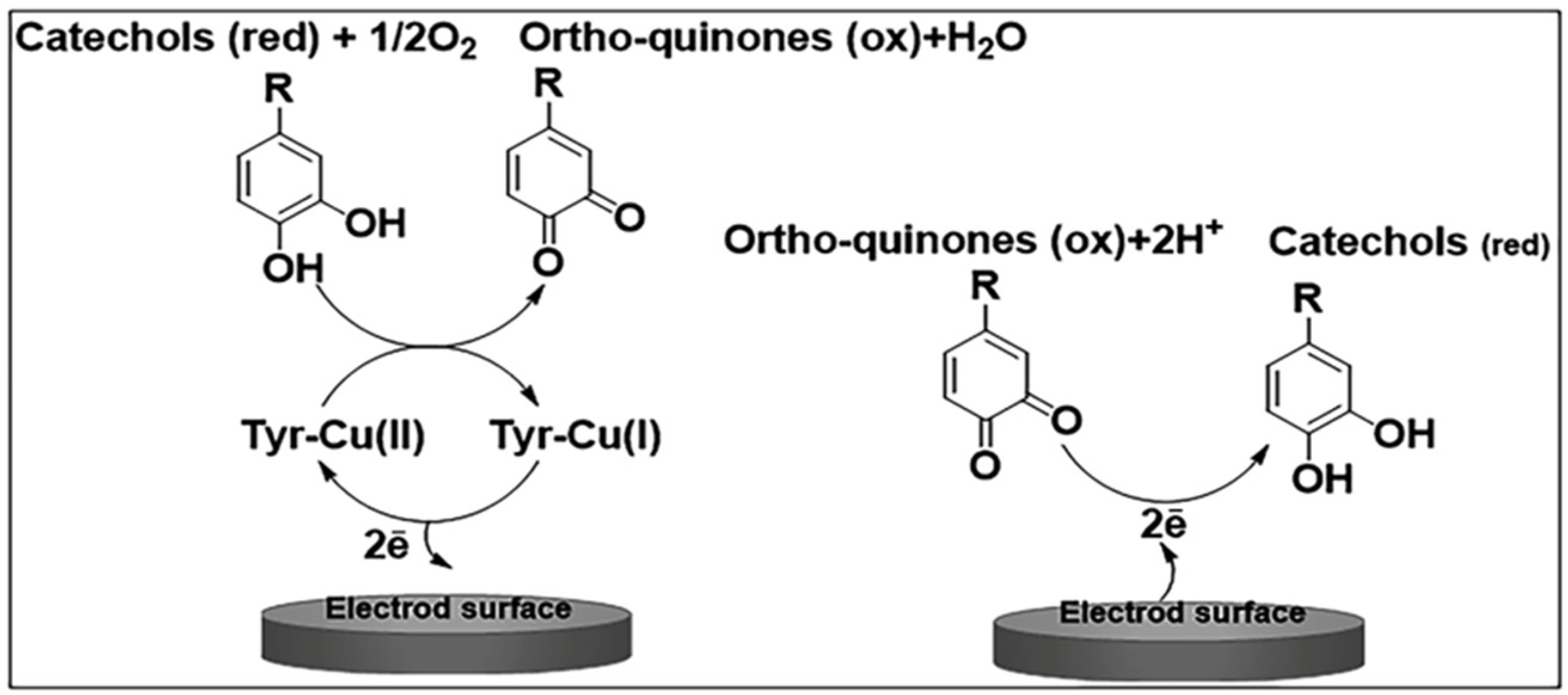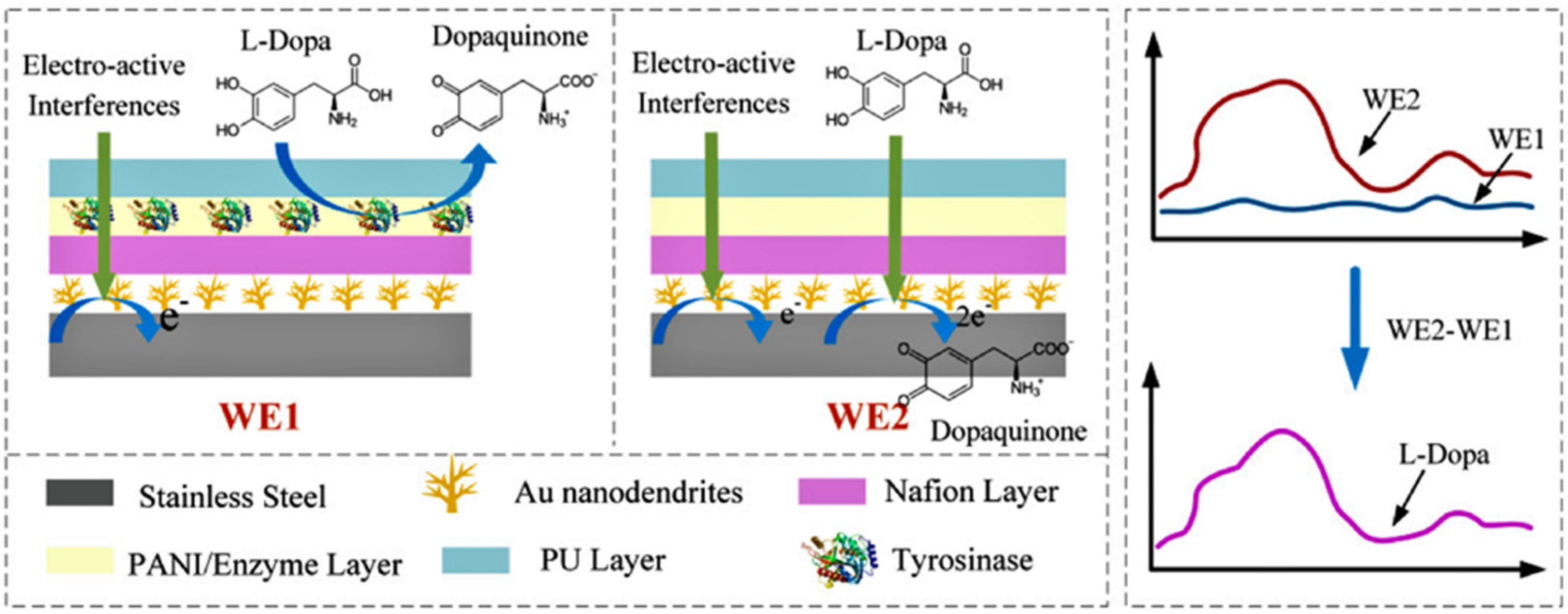 - Selectivity is a further critical issue arising from the examination of tyrosinase biosensors. As previously discussed, tyrosinase has broad substrate specificity, catalyzing naturally occurring compounds in biological samples such as dopamine, serotonin, adrenaline, and compounds like carbidopa found as a result of drug administration, as well as LD. Among the strategies adopted to solve interference problems, dual-sensing platforms have been proposed based on parallel, simultaneous, and independent enzymatic and nonenzymatic electrochemical detection [67,75]. Nafion has often been used as a protecting membrane towards negatively charged compounds such as ascorbic acid and uric acid. A drawback of this material is its susceptibility to membrane fouling, which limits the operational stability of biosensors. Alternative protective layers should be explored. More or less effective strategies have been developed to solve interference problems. However, this issue has not been properly solved and addressed. Biosensor selectivity has often been evaluated by testing a few potential interferent compounds, as well as at physiological concentration levels typical of healthy individuals, which can differ from those found in plasma from PD patients. Tyrosine and serotonin plasma levels, for instance, are lower than they would be under normal settings [90,91], whereas homocysteine plasma levels rise in levodopa-treated individuals [92]. This aspect should be taken into consideration in future interference studies.