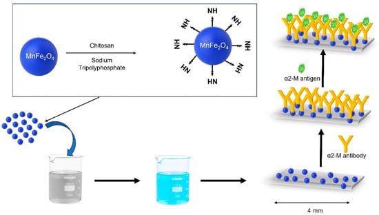 Furthermore, the synthesis of MnFe2O4@chitosan/MWCNTs/PDMS composite films via chemical co-precipitation has also been reported (Figure 1) [56]. The sensing platform was constructed to detect alpha2-macroglobulin (α2-M), which is critical in diabetic nephropathy diagnosis. This synthesis approach yielded numerous sites for highly efficient binding of the α2 m antibody. The results revealed a detection limit of 0.13 ng/mL and a linear range from 10 ng/mL to 100 μg/mL, which is significantly lower than the limit required for clinical assessment. In this work, MnFe2O4@chitosan NPs were synthesized by chemical co-precipitation and integrated into a biomedical sensing strategy due to the excellent magnetoelectric effect of this material and its interesting properties for building flexible biosensing surfaces. MnFe2O4@chitosan NPs were mixed (a) with MWCNTs to enhance the electrical conductivity and improve the sensitivity of the biosensor and (b) with PDMS to form a flexible film-based biosensor. On the one hand, the chitosan-coated MnFe2O4 particles provided biological modification sites for the capture antibody (α2 m antibody). This work showed that the synthesis of ferrite materials such as MnFe2O4 can be used to manufacture flexible biosensors, which have an enormous impact on biomedical device development.