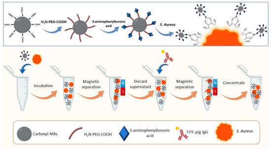 In addition, PEG was also utilized as a mediator to prepare a novel PEG-mediated APBA (m-aminophenylboronic acid)-functionalized magnetic nanomaterial (APBA-PEG-MN) for detecting Staphylococcus aureus by using magnetic separation and fluorescence analysis (Figure 3) [87]. The LOD in several matrices such as fruit juice, spinach, pure culture, and pool water were 270 CFU/mL. APBA-PEG-MNs confirmed good stability and could maintain good capture efficiency at 4 °C and different pH values. The collected results indicate that the magnetic separation–fluorescence sensor system can achieve fast, accurate, and specific detection of S. aureus.