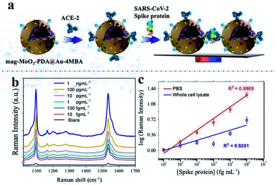- Achadu, O.J.; Nwaji, N.; Lee, D.; Lee, J.; Akinoglu, E.M.; Giersig, M.; Park, E.Y. 3D hierarchically porous magnetic molybdenum trioxide@gold nanospheres as a nanogap-enhanced Raman scattering biosensor for SARS-CoV-2. Nanoscale Adv. 2022, 4, 871–883. [Google Scholar] [CrossRef]