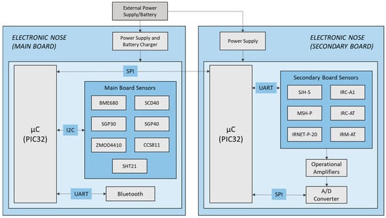 Figure 2 shows a block diagram of the electronic nose. The main board is formed with five MOX sensors and one NDIR type, which are communicated with the microcontroller (PIC32MM0256GPM048 Microchip) via I2C. Moreover, it sends the data received by all the sensors via Bluetooth to a smartphone.