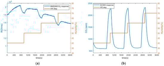 MOX and NDIR sensors response to humidity changes with CO2. (a) Resistance of BME680; (b) measured CO2 of SCD40.