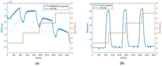 MOX and NDIR response to humidity changes with CH4. (a) Resistance of BME680; (b) SJH5 response.