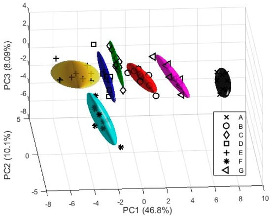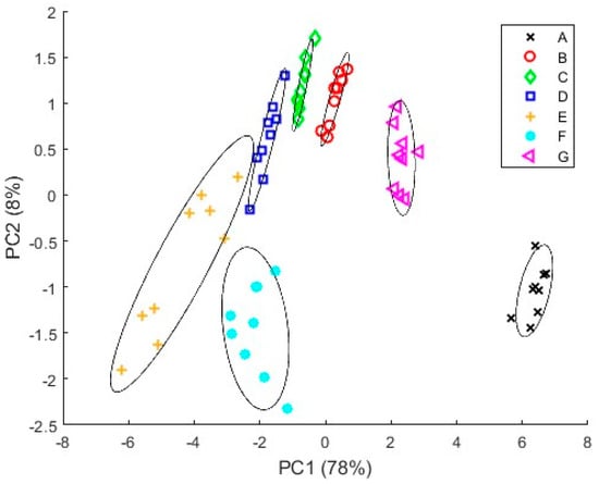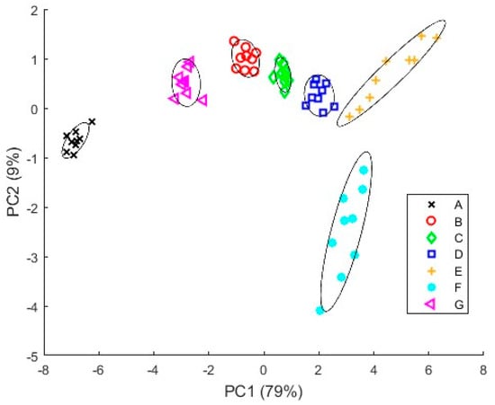 PCA score plot with MOX sensors. A: CO2 = 3000 ppm; B: CH4 = 1000 ppm, CO2 = 2000 ppm; C: CH4 = 1500 ppm, CO2 = 1500 ppm; D: CH4 = 2000 ppm, CO2 = 1000 ppm; E: CH4 = 2500 ppm, CO2 = 500 ppm; F: CH4 = 3000 ppm; G: CH4 = 500 ppm, CO2 = 2500 ppm.
