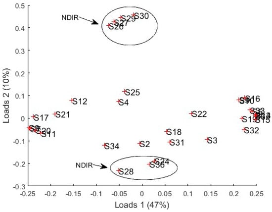Figure 13 shows the load plot of all the sensors. The load plot shows how important the contribution of a variable is in a PCA. The most important variables in PC2 are S24 (corresponding to IRC_A1), S26, S27, S28 (corresponding to IRC_AT), S29, S30 (corresponding to IRM_AT), and S36 (corresponding to IRNET); therefore, they have a negative effect in relation to the total response and cause a bigger dispersion. If the information of these signals is deleted from the analysis, this will eliminate the masking produced by them, and the correlation will improve. Further analysis in this section will aim to improve the PCA with reliable information from MOX sensors and NDIR sensors.