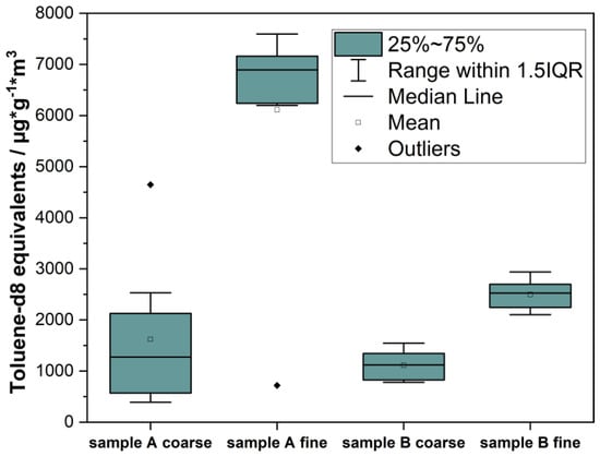 Boxplots of major volatile organic compounds for coarse and fine homogenized samples, eight repetitions. A Dixon’s Q-test found a significant outlier at the p = 0.05 level for sample “A fine”, which was excluded in further calculations.