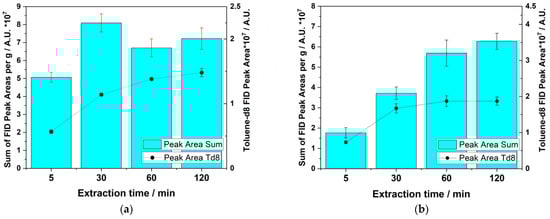 Testing of extraction times was conducted for (classical) HS-SPME, as it represents the benchmark for comparison. In this study, the extraction time for SPME of volatiles from powdered samples (pinewood strands and OSB), in combination with an internal standard (toluene-d8), was varied between 5 and 120 min, and the peak area of 20 volatile compounds was monitored.