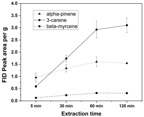 As can be seen from Figure 2, the total peak area of all volatiles reaches equilibrium at a time of 30 min for sample A. For sample B, this point is not reached even within 120 min for the sum of volatiles reviewed. However, a constant value can be seen after 60 min for individual compounds such as α-pinene, 3-carene, and β-myrcene, which represent three of the important odor compounds found in the sample (Figure 3) [].