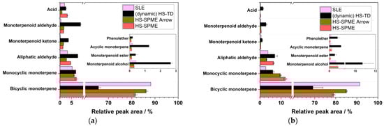 Relative fractions of detected compounds (Table 4 and Table 5) were grouped into compound classes, which were represented by bicyclic monoterpenes, monocyclic monoterpenes, aliphatic aldehydes, monoterpenoid ketones, monoterpenoid aldehydes, acids, monoterpenoid alcohols, monoterpenoid esters, acyclic monoterpenes, and phenol ethers (Figure 4). Bicyclic monoterpenes, comprising α-pinene, β-pinene, and 3-carene, dominated the chromatogram for both samples and all tested methods. In the case of (dynamic) HS-TD, the relative peak area for bicyclic monoterpenes is significantly reduced in comparison to the other methods. Additionally, the relative peak area of all other compound classes besides monocyclic monoterpenes is increased for (dynamic) HS-TD, which suggests a better representation and higher sensitivity over a wider variety of chemical classes in comparison to the other headspace methods, as well as the liquid extraction reference method. This distribution could in part be attributed to compounds of higher polarity, which were also shown by other authors to be favored in dynamic headspace sampling []. Classical HS-SPME and HS-SPME Arrow show a very similar distribution in peak fractions for individual compounds with a comparably high percentage in bicyclic monoterpenes. The correspondence of HS-SPME results with the reference method (SLE) is better in the case of sample A (Table 4) while dynamic HS-TD yields results more comparable to the reference method for sample B (Table 5). Both this observation and the RSD% values observed for both samples and the different extraction techniques reflect the large differences among sample constituents in terms of concentration and chemical nature/polarity. As a general trend, it can be concluded from the data that RSD% values of the fractions of individual constituents would become larger with decreasing concentration and increasing polarity of the analyte, which appears plausible, considering the relatively apolar nature of the sorbent phases used in all extraction schemes applied.