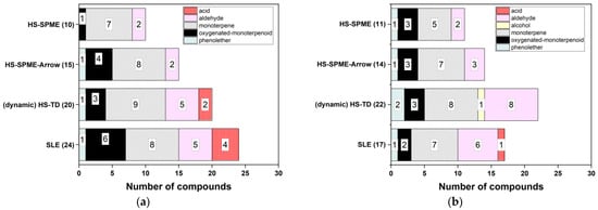 Number of compounds according to chemical classes and sample preparation method as detected by GC–O; (a) sample A; (b) sample B.