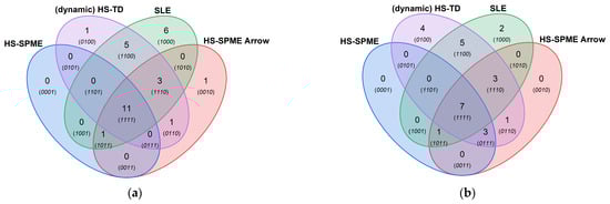 Venn diagrams of all compounds by method to indicate the number of compounds detected by only one or by several techniques used; (a) sample A; (b) sample B.