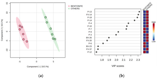 Statistica version 13.2 software (StatSoft Inc., Tulsa, OK, USA) was used to perform statistical data elaboration by one-way analysis of variance (ANOVA) and Fischer’s least significant differences (LSD) test at p < 0.05 to compare the mean values (n = 3). The obtained physicochemical, HPLC-DAD, GC-FID, and GC-MS analysis data were further processed by a supervised multivariate statistical analysis technique, partial least squares-discriminant analysis (PLS-DA) using MetaboAnalyst v. 5.0 software (http://www.metaboanalyst.ca, accessed on 16 July 2023). By minimizing the variance within and maximizing the variance between different categories (e.g., treatments), PLS-DA can give information about variables (parameters, compounds) with the greatest ability to differentiate investigated treatments in the form of variable importance in projection (VIP) scores. To better evaluate the effects of bentonite and tannins added during fermentation separately, PLS-DA was applied to four sets of data. Variables included in the first two sets were the analysis data obtained after fermentation (AFerm) with nine unidentified phenolic/tannin compounds (T1-T9), total flavonoids and total phenols excluded. Variables included in the third and fourth sets comprised analogous data obtained after additional bentonite fining (ProStab). In the first and third sets, the samples were divided into two groups, one containing wines fermented with the addition of bentonite (B and BT) and the other including other wines (CO and T), regardless of the presence of exogenous tannins. In the second and fourth sets, the samples were again divided into two groups, one containing wines fermented with the addition of tannins (T and BT) and the other including other wines (CO and B), regardless of the presence of bentonite.