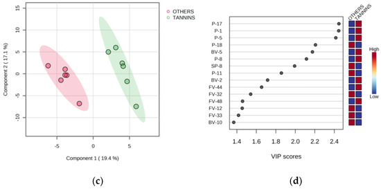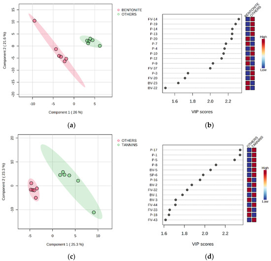 (a) Differentiation of Malvazija istarska wines produced with bentonite in fermentation (BENTONITE, B and BT) from other wines produced without bentonite in fermentation (OTHERS, CO and T) by partial least squares-discriminant analysis (PLS-DA); (b) variable importance in projection (VIP) scores of the variables most useful for the differentiation based on the addition of bentonite; (c) differentiation of Malvazija istarska wines produced with the addition of tannins in fermentation (TANNINS, T and BT) from other wines produced without tannins in fermentation (OTHERS, CO and B) by PLS-DA; (d) variable importance in projection (VIP) scores of the variables most useful for the differentiation based on the addition of tannins. Abbreviations: CO—control wine without added tannins and without bentonite in fermentation; B—bentonite added near the end of fermentation; T—tannins added during fermentation, without bentonite in fermentation; BT—tannins and bentonite added during fermentation, in the same manner as in T and B treatments; SP—standard physicochemical parameters; P—phenols; FV—free volatile aroma compounds; BV—bound volatile aroma compounds—the codes correspond to those reported in Table 4 for wines analyzed after additional bentonite fining (ProStab).
