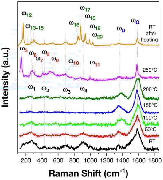 In situ Raman spectra during heating of V2CTx MXene film in air in the temperature range RT–250 °C.