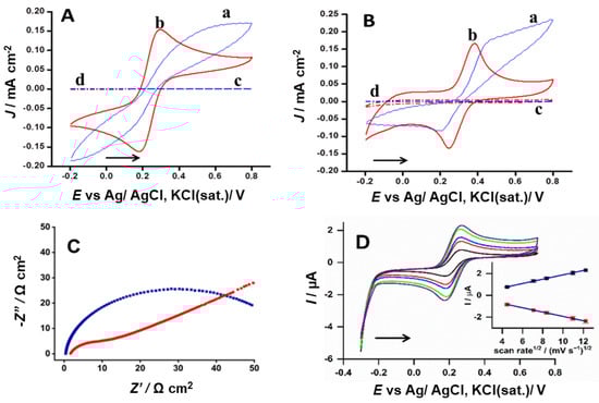 (A,B) Cyclic voltammograms (CVs) recorded with a scan rate of 50 mV s−1 using non-treated—NTGr (blue) and treated—LTGr (red) H-type graphite, treated under the optimized condition of laser treatment. (A) CVs of the non-treated (a, c) and treated (b, d) electrode in KCl 0.10 mol L−1 (a, b) and in presence of 0.10 mol L−1 KCl aqueous + 1.0 mmol L−1 [Fe(CN6)]3−/4−; (B) CVs of the non-treated (a, c) and treated (b, d) electrode in 0.1 mol L−1 acetate buffer (a, b) and in presence of 0.10 mol L−1 acetate buffer + 1.0 mmol L−1 dopamine (b, d). (C) Electrochemical impedance spectroscopy (EIS) performed at the open-circuit potential in 0.10 mol L−1 KCl solution containing 4.0 mmol L−1 of [Fe(CN)6]3−/4− using non-treated (blue) and treated (red) graphite electrodes, applying alternated potential with an amplitude of 0.01 RMS, operating over the 0.10 Hz to 100 kHz frequency range. (D) CVs at different scan rates in 1.0 mmol L−1 [Fe(CN)6]3−/4−, performed at 20, 50, 70, 120, and 150 mV s−1.