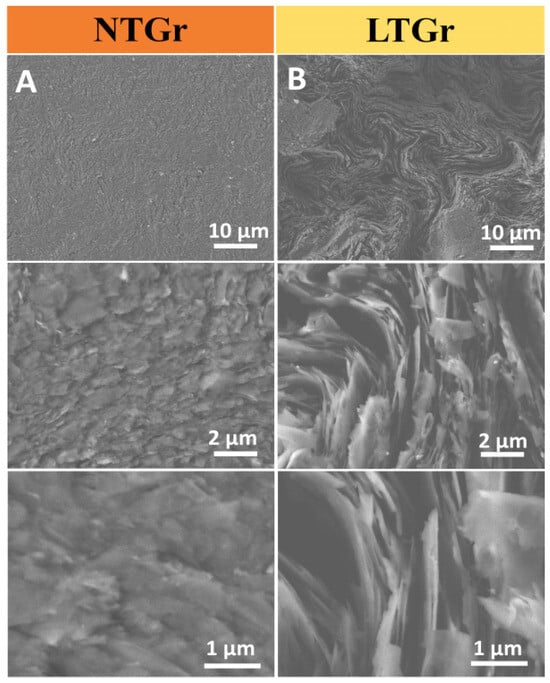The effect of the laser treatment on the morphological structure of the H-type LTGr electrode was analyzed using FE-SEM (Figure 4) [19]. The NTGr surface polished on sulphite paper shows a relatively rough and scaly surface (Column 4A). After treatment with laser (Column 4B), the electrode surface shows a more complex (like eroded soils) morphology with a visible increase in the surface area with more visible graphite-exposed platelets (tactoids) [20]. In fact, the laser treatment introduced remarkable changes in the morphology of the graphite [21], an aspect that contributed to the improved electrochemical response [22].