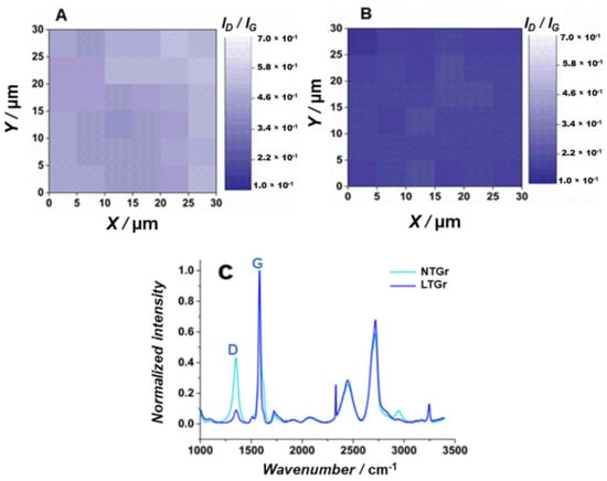Raman mapping of (A) NTGr and (B) LTGr, obtained using a laser with wavelength of 532 nm with a lens of ×5 of augmentation, laser power of 100%, exposure time of 5 s, and accumulation of 1 in an area of 11 × 11 µm. (C) Raman spectrum (λexc = 532 nm) of NTGr (cyan line), LTGr (royal blue line).