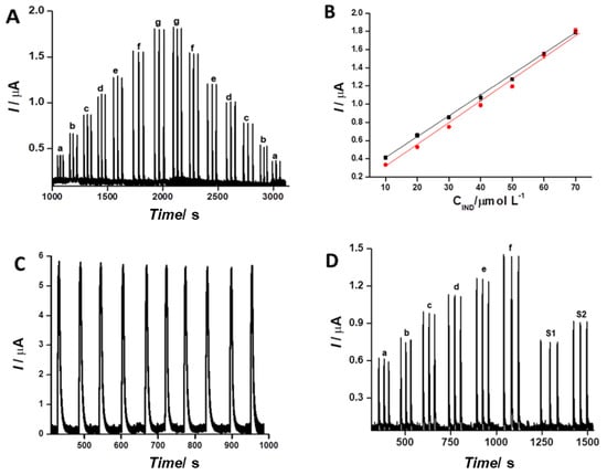 (A) Analytical curves with increasing and decreasing IND concentrations ranging from (a) 10, (b) 20, (c) 30, (d) 40, (e) 50, (f) 60, (g) 70 µmol L−1. (B) Linear adjustments in the calibration curves with increasing and decreasing IND concentration. (C) Repeatability studies (n = 10) of 1.0 mmol L−1 IND. (D) Amperogram for determination of IND by the FIA system in enriched synthetic urine. Analytical curve (a) 20, (b) 30, (c) 40, (d) 50, (e) 60, (f) 70 µmol L−1, (S1) sample 1, and (S2) sample 2. Experimental conditions: 0.10 mol L−1 phosphate buffer (pH = 12), 150 µL sampling loop, flow rate 1.6 mL/min, and potential +0.20 V vs. Ag/AgCl,KCl(sat.).