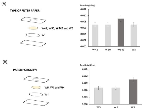 The type of filter paper, different paper treatments, and paper porosity of the reagent layer (R in Figure 2A) were tested to obtain the highest sensitivity.