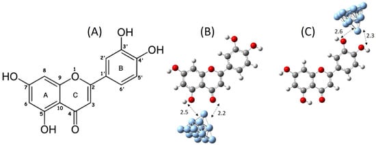 The atom numbering and ring labeling of the three rings for luteolin is shown in Figure 1. If luteolin is exposed to a metal surface, it presents two different sites, which should be prone to adsorption by the metal, i.e., C(4)=O/C(5)-OH on rings C and A, and C(3′)-OH/C(4′)-OH on ring B.