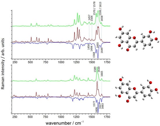 The calculated spectra were given a Lorentzian FWHM of 6 cm−1, and a scaling factor of 0.97 was applied to the calculated wavenumbers such that a good match of frequencies with the experimental ones was obtained for the luteolin molecule. Indeed, previous work suggested the use of a double frequency scaling factor for better agreement between calculated and experimental data, but we prefer not to over-parametrize our model [].