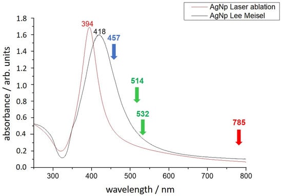 We have registered the luteolin SERS spectrum at different excitation wavelengths and with different plasmonic nanoparticles. In Figure 4, we show the plasmonic extinction band of the different AgNPs used, obtained by laser ablation of chemical reduction of Ag+ ions, together with markers at the different excitation wavelengths used for our experiments (1064 nm excitation not shown). The wavelength of the peak extinction band is a measure of the AgNPs average dimensions, and the bandwidth of the peak is proportional to the size dispersion. Therefore, from our data, it is clear that the AgNPs obtained by laser ablation are smaller in diameter and quite uniform in dimensions, while those from synthesis are larger and produced in a wider set of dimensions. In both cases, the wavelength of laser excitation for the SERS experiments is larger than the absorption maximum.