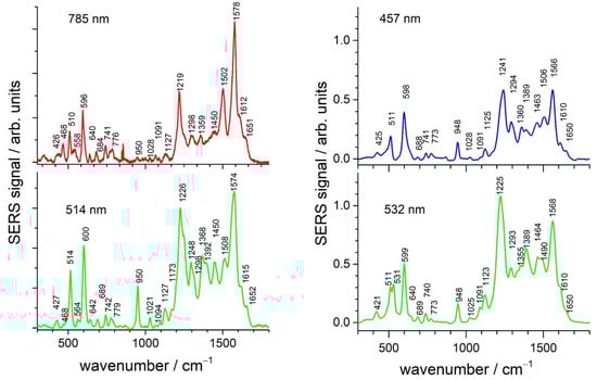 For the Raman spectra of the solid, the laser power on the sample was 2 mW in the case of 785 nm excitation and 20 µW in the case of 514 nm excitation, with an integration time of 10 s for 10 averages. For SERS measurements, a laser power of about 1 mW and 200 µW, respectively, for 785 nm and 514 nm excitation wavelengths was used, and the integration time was 10 s.