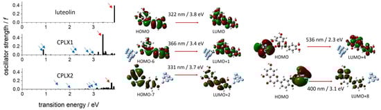In detail, from our calculations, we find that the near UV-allowed electronic transition of luteolin is described as arising from two allowed electronic transitions (at 353 (weak) and 322 (f = 0.40) nm; experimental value 348 nm in water and 352 nm in ethanol), in agreement with previous computational work, while, in CPLX1 and CPLX2, the lowest intramolecular electronic transition, similar to the HOMO-LUMO luteolin transition, is calculated at 366 (f = 0.48) and 331 (f = 0.15) nm, respectively []. A large difference for the intramolecular electronic transition for the different complex conformations was already reported for the luteolin–Al3+ complexes [].