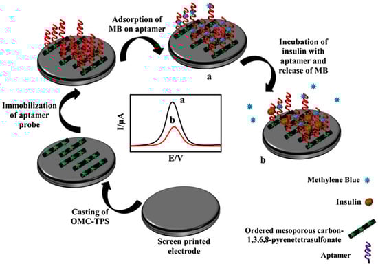 Categorized as a metabolic disorder, diabetes stands as a major health issue worldwide. Issues associated with insulin supply and production in the human body are responsible for diabetes. Insulin is a hormone containing a double-chain polypeptide. To determine insulin levels, an electrochemical method was recommended by Amouzadeh’s group, which is based on an aptasensor at femtomolar (fM) concentrations, in which the surface of the SPE is modified by means of the ordered mesoporous carbon, which underwent chemical modification by 1,3,6,8-pyrenetetrasulfonate (TPS) (Figure 6). In this way, with the use of the reactive sulfonyl chloride groups, the aptamer functionalized with amino groups was covalently bonded to the TPS. Afterward, the MB was intercalated with the immobilized aptamer, which was considered in this context as the redox probe. It was possible for the modified MB to relate to the insulin, resulting in the MB release while minimizing the signal attained by the DPV [107].