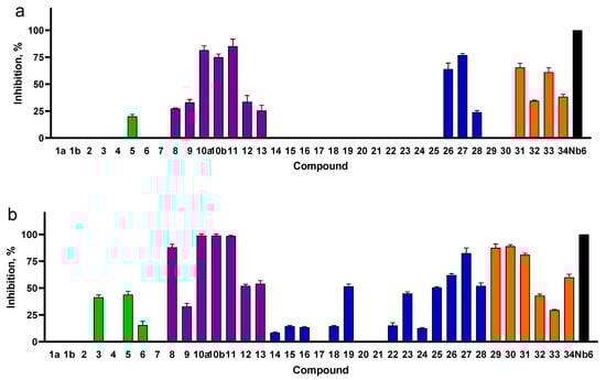 To assess the specificity of the inhibitory activity of dyes for some substances, the analysis was carried out in the presence of an excess of albumin. It turned out that for substances 10a, 10b, and 11, the presence of excess albumin did not significantly affect the inhibitory activity, while for substances 27 and 31, it did. This result is not surprising, as above-mentioned, as the substances belonging to the group of dyes are often characterized by non-specific affinity to proteins [].
