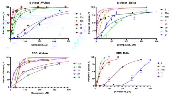 For compounds 8, 10a, 10b, 11, 29, 30, 31, which showed 90% inhibition at 500 μM, the semi-inhibitory concentration (IC50) for the RBD and S variants of the Wuhan and Delta SARS-CoV-2 were determined (Figure 3).