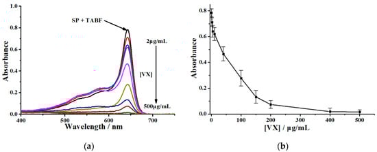 (a) UV−Vis spectra changes in colorimetric solution with increasing VX concentration; (b) curve of absorbance with VX concentration at 644 nm.