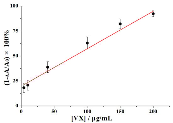 As displayed in Figure 3, a curve was obtained by plotting the rate of change in absorbance at 644 nm against the quadratic root of the VX concentration [VX]. On the ordinate, (1 − ΔA/A0) × 100% is plotted, where A0 was the initial absorbance and ΔA is the difference in the absorbance corresponding to before and after VX was added into the colorimetric solution, respectively. When the concentration of VX was in the range of 4~200 μg/mL, (1 − ΔA/A0)×100% and [VX] showed a linear relationship, and the following relation was obtained: