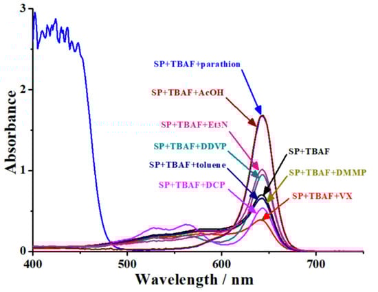 To evaluate the colorimetry method’s VX detection specificity, 4 mg/mL of organophosphorus pesticides (parathion and DDVP), phosphorus-containing reagents (DCP and DMMP), a benzene series (toluene), an acid (acetic acid), and a base (triethylamine) were added separately to colorimetric solutions containing 2 μg/mL SP and 250 μg/mL TBAF, and their absorption spectra were recorded with the same procedure as that used to detect VX. Meanwhile, to investigate the anti-interference of the colorimetry method, solutions containing 2 μg/mL SP, 250 μg/mL TBAF, and 10 μg/mL VX were treated with 1 mg/mL parathion, DDVP, DCP, DMMP, toluene, AcOH, and Et3N, and their absorption spectra were measured with the same procedure used to detect VX.