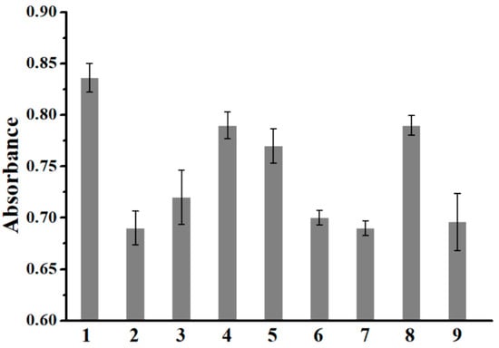 To examine whether the colorimetry method developed in this article could maintain the sensing of VX under the potential competition of interferents, its anti-interference capability was studied. Parathion, DDVP, DCP, DMMP, toluene, AcOH, and Et3N were added at the 100 equiv. of VX. As shown in Figure 6, DDVP, DCP, and AcOH had slightly noticeable effects on the detection of VX, which increased the A of the colorimetric solutions and lowered the calculated concentrations. The other interferents did not appear to interfere significantly with the detection of VX. It can be concluded that the colorimetry method could still detect VX in the presence of the 100 equiv. of these different interferents; however, its quantitative detection was, unfortunately, interfered. Therefore, the influence of interferents such as DDVP, DCP, and AcOH on the detection results should be taken in account when performing colorimetry.