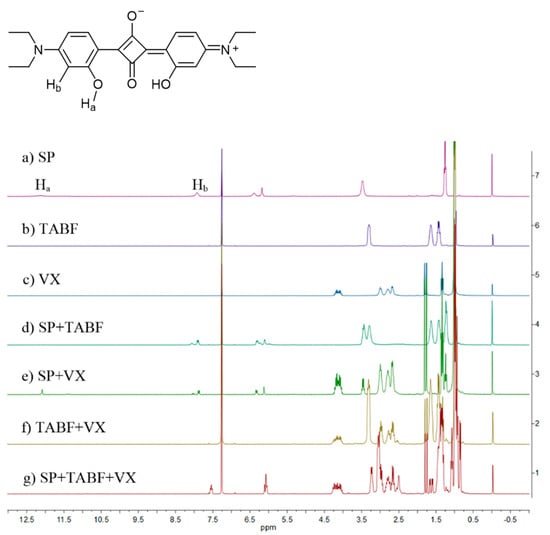 1H NMR spectra of the SP (a), TBAF (b), VX (c), the mixture of the SP with TBAF (d), the mixture of the SP with VX (e), the mixture of TBAF with VX (f), and the mixture of the SP with TBAF and VX (g).
