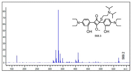 Squaraine compounds are a class of excellent functional dyes with unique D–A–D conjugated structures [], extremely high molar extinction coefficients, and strong absorption and fluorescence emission in the visible and near-infrared regions [,]. The unique structural characteristics of squaraine dyes make them easy to be attacked by nucleophiles [,]. As colorimetric and fluorescent probes, squaraine dyes are used in the detection of proteins [,], small biological molecules [,], environmental pollutants [], and metal ions [,,].
