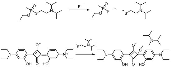 A proposed mechanism is illustrated in Scheme 2, in which a fluoride anion reacts with VX to generate a thiolate fragment. The thiolate anion initiates a nucleophilic attack on the electron-deficient central four-membered squaric acid ring in the SP. Then, the nucleophilic attack of the thiolate fragment breaks the conjugation in the SP and induces color fading.