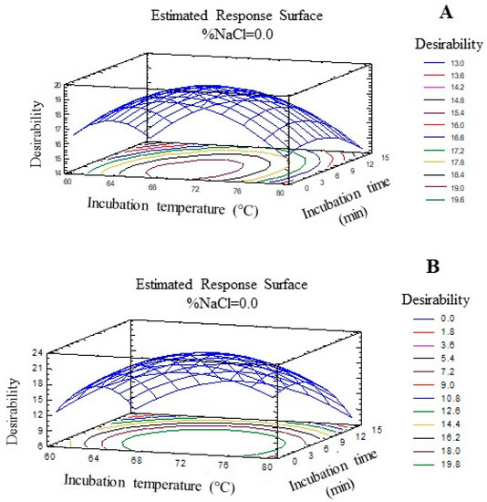 Estimated response surface for the study of the variables: %NaCl, temperature, and time of incubation, obtained by multiple response optimisation for serum (A) and urine (B) samples.