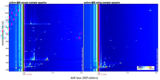 The potential of the HS-GC-IMS with chemometric tools for classification between healthy and IBD patients and between disease stages (active and remission) in urine and serum has been evaluated. All binary models achieved 100% sensitivity and precision, which demonstrates the robustness of the OPLS-DA models for IBD diagnosis using both urine and serum samples. However, only serum samples are suitable to discriminate between IBD-diseased patients in the active or remission stage.