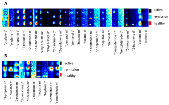 - Bodelier, A.G.L.; Smolinska, A.; Baranska, A.; Dallinga, J.W.; Mujagic, Z.; Vanhees, K.; Van Den Heuvel, T.; Masclee, A.A.M.; Jonkers, D.; Pierik, M.J.; et al. Volatile organic compounds in exhaled air as novel marker for disease activity in crohn’ s disease: A metabolomic approach. Inflamm. Bowel Dis. 2015, 21, 1776–1785. [Google Scholar] [CrossRef] [PubMed]
