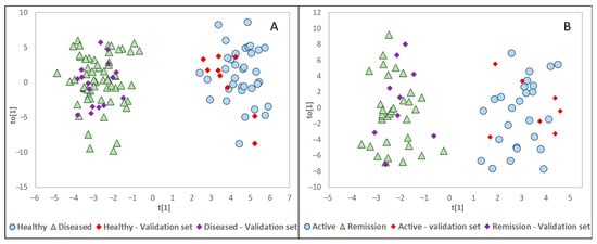 In a second approach, a chemometric model is created to differentiate whether the patient is in the active phase of IBD or the remission stage. In this case, the dataset was composed only of urine samples from diseased patients (77 urine samples × 193 markers). The calibration set consisted of a total of 61 samples, including 27 in the active stage and 34 in the remission stage. The validation set consisted of 7 active and 9 remission IBD stage patients, giving a total of 16 validation samples, as in the previous model, working with data normalized with respect to RIP intensity and unnormalized data adjusted to the UV scale were studied. The results obtained using the different model fits are shown in Supplementary Table S2. The best results were obtained with data normalized to the RIP intensity and adjusted to the UV scale. The score plot of the optimal OPLS-DA model is shown in Figure 5B, which achieves the best calibration and validation success rates (100% in both cases) and the highest Q2 value (Q2 = 0.190). However, it cannot be considered a valid model, as the parameter Q2, which measures the predictive ability of the model, is lower than 0.4, the minimum recommended value to consider the model valid in metabolomics.