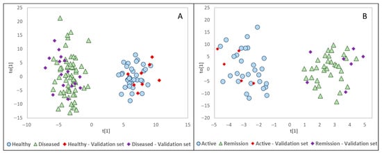 (A) Score-plots of binary OPLS-DA model using normalized data with respect to RIP intensity and UV scaling to discriminate between urine of diseased and healthy IBD volunteers. (B) Score-plots of binary OPLS-DA model using normalized data with respect to RIP intensity and UV scaling to discriminate between urine of IBD diseased patients in active or remission stage.