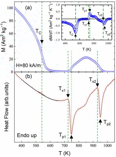 Figure 1a displays the typical ferromagnetic (FM) behaviour below the Curie temperature TC at about 540 K. This value of the Curie point is close to the ones reported in the literature for FeNi-based amorphous systems, in which the addition of small amounts of elements produces a rather smooth change in their Curie temperature [,]. This ferro-to-paramagnetic transition is revealed in the calorimetric measurement with a small bump at around 540 K, as indicated by a green-dashed line in Figure 1. Above TC, the as-cast ribbon sample undergoes a second magnetic-phase transition as the temperature increases from the paramagnetic state (PM), as seen in Figure 1a. This second phase-transition is sensitive to the Ni content as reported for the (Fe1−xNix)81Nb7B12 ribbon samples and results in a decrease in both their ferromagnetic-strength and their transition temperatures [].