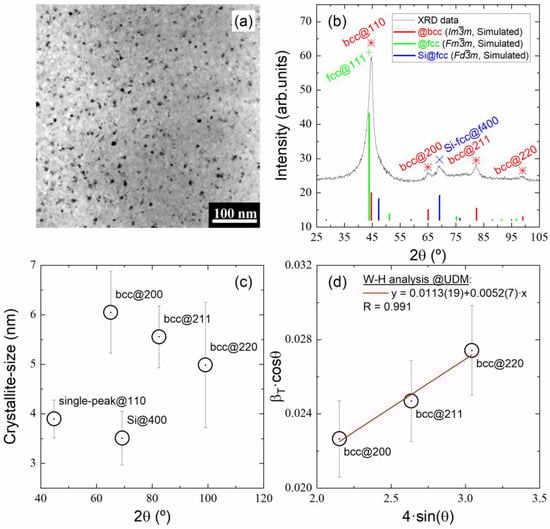 where ⟨ϵ⟩ is the mean value of the microstrain that it is assumed to be uniform. By this approach, we obtain a crystallite size of 12 ± 2 nm and a mean microstrain of 52 ± 7 × 10−4, as observed in the Williamson–Hall plot shown in Figure 2d. Therefore, the crystallite sizes of the nanograins of the bcc-(Fe,Ni) phase determined by both TEM and XRD data are in very good agreement.