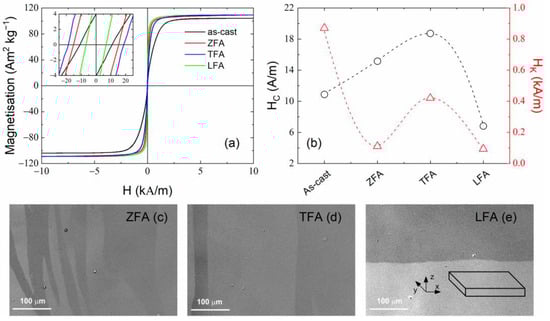 Figure 3a shows the HLs of the as-cast, ZFA, TFA, and LFA annealed ribbons. Typical soft-magnetic materials are characterised by very low coercive fields HC, as seen in the inset of Figure 3a and in Figure 3b [,,]. Indeed, the coercivity reduction with respect to the increment of Ni content for the (Fe1−xNix)81Nb7B samples annealed at 773 K was already reported by Turčanová et al. []. As expected, the LFA sample exhibits the softest magnetic properties with a coercivity of 7 A/m. However, ZFA and TFA samples show a deterioration in their coercivity with respect to the as-cast one. This is due to the directional ordering of atomic pairs mechanism [,]. The lowering in the coercive field after LFA has already been noticed in several other soft-magnetic nanocrystalline systems [,,] and can be described by the formation of magnetic-domain structures preferentially oriented along the ribbon axis, which enhances magnetisation processes brought about by the 180° domain-wall motion occurring at lower fields [,]. Panels (c–e) of Figure 3 show the different magnetic-domain structures obtained by MOKE for all the annealing samples. The ZFA ribbons exhibit a tendency to form irregular transversally patched magnetic domains as seen in Figure 3c, whereas the LFA and TFA samples show the presence of wide magnetic domains aligned in longitudinal and transversal directions, respectively, as expected.