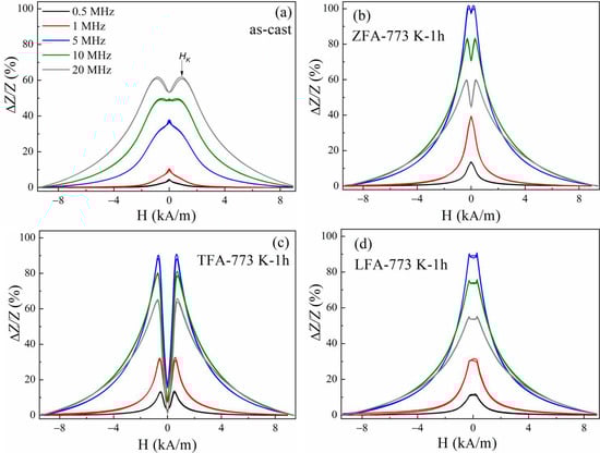 To pinpoint the effects of field annealing on the MI response, a detailed study of the frequency and magnetic-field dependence has been performed. Figure 4 gathers the magnetic-field dependence of the MI response for the set of as-cast and field-annealed (Fe3Ni)81Nb7B12 ribbon samples studied in this work. In all cases, both the external dc magnetic field and the driving ac current were applied along the ribbon-axis direction at the selected frequencies. Within this intermediate frequency regime, it has been reported that for small ferromagnetic conductors such as ribbon samples, the magnetisation rotation is the main contribution to the GMI effect. This is because at high enough frequencies, the domain wall motion is strongly damped due to eddy currents formation, and therefore, its contribution can be neglected [,,].