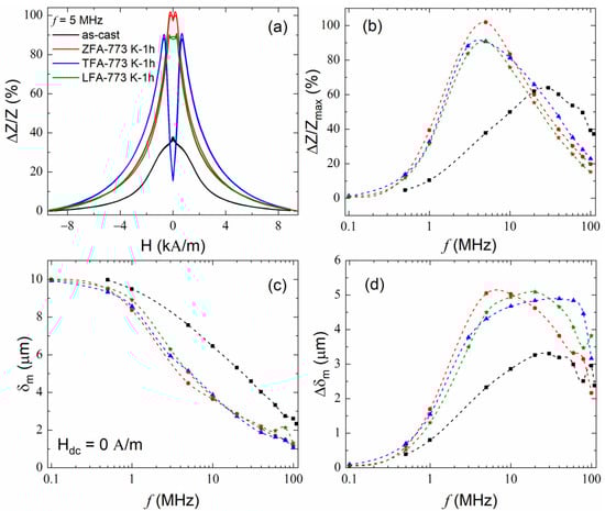 Magnetic-field dependence of the MI response for the as-cast and annealed (Fe3Ni)81Nb7B12 ribbon samples (a), in which the driving frequency is equal to 5 MHz. Panel (b) shows the frequency dependence of the maximum MI response (ΔZ/Zmax(%)). Panel (c) shows the frequency dependence of the calculated skin depth δm, and panel (d) displays the variation of the skin depth  for all samples. In panels (b–d), symbols denote the experimental data, whereas the dashed lines are guides to the eye.