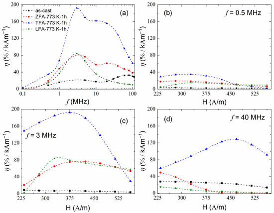 Frequency dependence of the field sensitivity η(%/(kAm−1)) determined by Equation (7) for all ribbon samples (a). Panels (b–d) show the magnetic field dependence of the sensitivity at selected frequencies for all studied ribbon samples. In panels (b–d), symbols denote the experimental data, whereas dashed lines are guides to the eye.